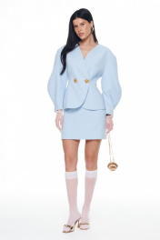 Костюм из плотной поливискозы состоящий из жакета и мини-юбки. Жакет на подкладке приталенного силуэта придаёт фигуре эффект песочных часов. Архитектурные рукава делают образ сложным и изысканным. Застежка на две большие золотые пуговицы. Юбка-мини на подкладке с застёжкой на потайную молнию сзади. Длина жакета 42-46р - 60,5см; Длина юбки 42-46р - 45см.