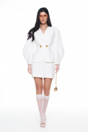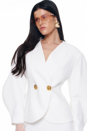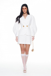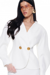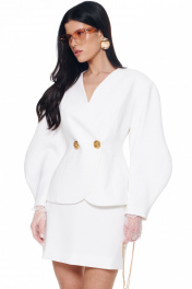 Костюм из плотной поливискозы состоящий из жакета и мини-юбки. Жакет на подкладке приталенного силуэта придаёт фигуре эффект песочных часов. Архитектурные рукава делают образ сложным и изысканным. Застежка на две большие золотые пуговицы. Юбка-мини на подкладке с застёжкой на потайную молнию сзади. Длина жакета 42-46р - 60,5см; Длина юбки 42-46р - 45см.
