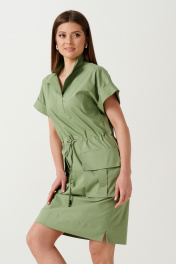 Платье женское из хлопковой ткани для повседневной носки. Платье прямого силуэта с коротким цельнокроеным рукавом оформленым отложной манжетой. Платье с кулисой по талии и разрезами в боковых швах от низа изделия. По переду накладные карманы с клапаном. По спинке отрезная кокетка.