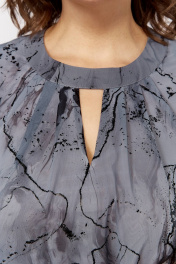 Нарядное женское платье из шифона с добавлением шелка, на подкладке. Удлиненное, силуэт расширенный к низу. Вырез горловины круглый с планкой и застежкой по спинке на петлю с пуговицей. По переду ниже планки неглубокие складки и У-образный разрез. Рукав длинный с резинкой по низу.