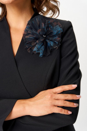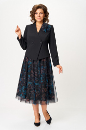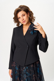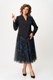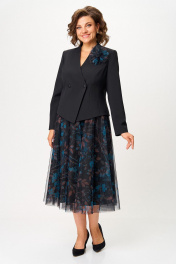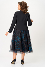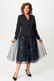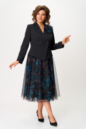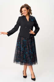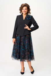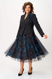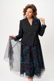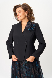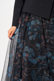 Нарядный женский костюм, состоящий из жакета и юбки. Жакет из ткани с добавлением вискозы, на подкладке, полуприлегающего силуэта, укороченный, с фигурной двубортной застежкой и У-образным вырезом горловины с невысокой цельнокроеной стойкой, рукав длинный. Юбка "полусолнце" из двух слоев сетки с принтом, на подкладке, с декоративной резинкой по талии.