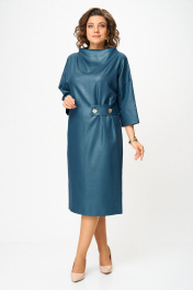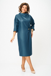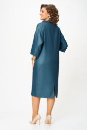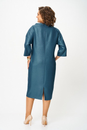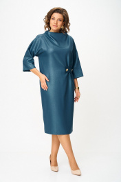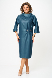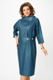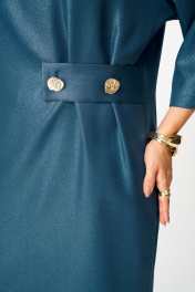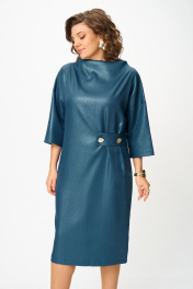 Нарядное женское платье из плательной ткани с легким блеском. Силуэт прямой, длина чуть ниже колена, с невысокой цельнокроеной стойкой. Линия плеча слегка опущена, рукав 3/4, по переду ассиметричные складки на уровне талии, с отлетной деталью в виде пояса, украшенного большими декоративными пуговицами, по спинке в среднем шве разрез.