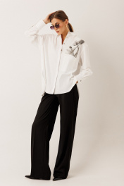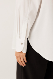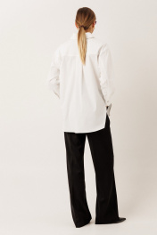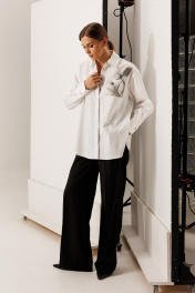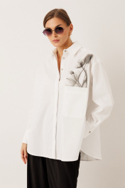 Блузка из хлопковой ткани: – свободный силуэт – модель комфортная и подходящая для разных типов фигуры – по переду — дизайнерский принт и накладной карман – спинка удлинённая – фигурный низ и разрезы по боковым швам – застёжка сквозная на потайные петли и пуговицы – воротник рубашечного типа – спинка с горизонтальной кокеткой и глубокой бантовой складкой от кокетки