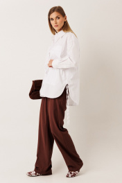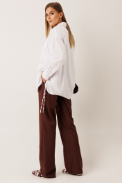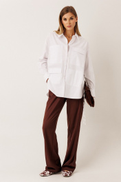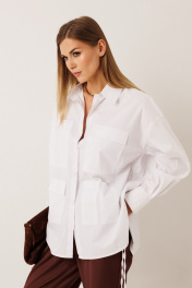 Блузка в стиле милитари: – свободный силуэт – по переду расположены накладные карманы — с клапанами и без, разной ширины. Асимметрия визуально стройнит фигуру – по спинке — кокетка со складками для удобства движения рук – застёжка спереди на пуговицы – по бокам — кулиса: шнурки можно затянуть и завязать, создавая новый силуэт рубашки