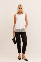 Блузка: - А‑силуэт - лаконичный дизайн - круглый вырез горловины - французское кружево по линии низа - разрез по спинке от горловины - застёжка на пуговицу