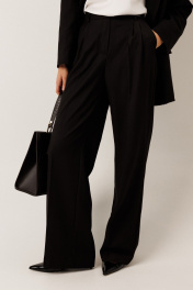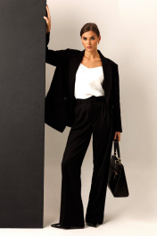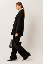 Комплект состоит из жакета и брюк: жакет плотной полувискозной ткани: – свободный крой – на подкладке – застёжка на пуговицы – воротник классический пиджачный – по переду — карманы с клапанами – рукав втачной – спинка со средним швом – лаконичная базовая вещь в любом гардеробе брюки: – прямой силуэт – застёжка на молнию и пуговицу – по переду — складки – боковые карманы с наклонным входом – удобные, классические для повседневной носки