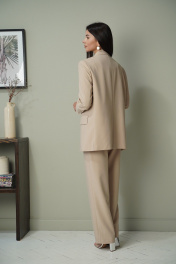 Комплект женский 2-ух предметный (жакет, брюки) Жакет прямого силуэта, застёжка центральная на 2 петли-пуговицы. По переду прорезные карманы с клапаном и двумя обтачками. Спинка со средним швом. Рукав втачной двухшовный, с отлетной шлицей по низу, застёгивающейся на петли-пуговицы. Брюки прямые, на правой задней половинке карман с листочкой (не функциональный). По передним половинкам карманы в подрезе. Брюки на поясе, внутренний срез пояса обработан окантовкой. Длина жакета 73 см. Длина рукава 62 см. Длина брюк 108 см.ВНИМАНИЕ! Фурнитура может отличаться от фото!