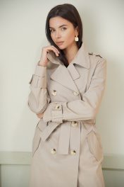 Плащ прямого силуэта, без подкладки, внутренние срезы швов окантованы отделочной тканью. Застёжка двубортная на 3-и петли-пуговицы. По переду прорезные карманы с клапанами. Рукав втачной, двухшовный. По низу рукава пата, по плечу пата-"погон", застёгивающиеся на пуговицы. Спинка со средним швом и шлицей по низу. Воротник пиджачный, с отрезной стойкой. В комплекте завязывающийся пояс из основной ткани. Длина плаща 109 см. Длина рукава 62 см.<br /> ВНИМАНИЕ! Фурнитура может отличаться от фото!