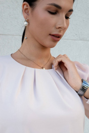 Универсальное платье полуприлегающего силуэта. На спинке две выточки.Горловина круглой формы с двумя встречными складками.Длинные, пышные рукава из шифона с широкими манжетами, которые застегиваются на три перламутровые пуговицы. На спинке застежка в виде капельки.Ткань немного тянется, но при этом сохраняет форму, приятна для тела, Достаточно лаконичный фасон, позволяющий выглядеть стильно и элегантно. Такой фасон платья может использоваться не только в качестве повседневной одежды, но и для офиса, в качестве торжественных и вечерних нарядов. Обхват груди: 44размер-98см, 46размер-104см, 48размер-108см, Обхват талии: 44размер-86см, 46размер-92см, 48размер-96см, Длина изделия: 44размер-87см, 46размер-89см, 48размер-91см, Длина рукава: 44размер-60см, 46размер-61см, 48размер-61см.