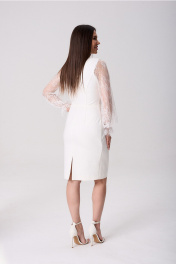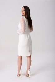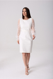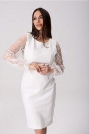 Платье полуприлегающего силуэта выполнено из плотной высококачественной вискозной ткани джерси с лайкрой. По линии талии платье отрезное и с притачной узкой планкой. Лиф состоит из центральной части и рельефов выходящих из пройм. Вырез горловины лодочка. Спинка состоит из центральной части и рельефов выходящих из пройм. Юбка с застроченными талиевыми вытачками по переду и спинке. По центру спинки застёжка на потайную тесьму-молнию. По центру шва в низу отлетная открытая шлица ( разрез). Рукав длинный из нежного французского кружева. По окату рукава выполнена лёгкая сборка. Нижний край рукава присобран с помощью тонкой эластичной тесьмы и завершён фистоном с ресничками. Платье может быть одето как для торжественных и особенных случаев, так и для повседневной носки. Длина рукава 65см Длина платья по центру спинки -95см
