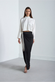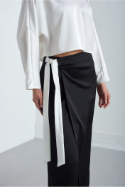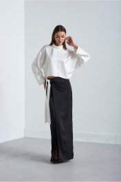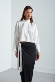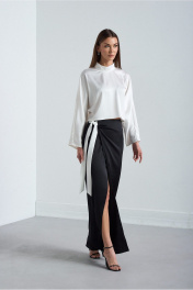 Костюм 2х предметный. Выполнен их высококачественной смесовой ткани из натуральных волокон. Блузка-кимоно с цельнокроенным свободным рукавом. По переду низ прямой, по спинке слегка закруглён к боковым швам и длиннее по центру спины, чем перед. Спинка со средним швоми застёжкой по центру и стойке на потайную тесьму-молнию. Силуэт свободный Юбка длинною впол с линией полузаноса открывающей частично правую ногу. Правая деталь юбки застёгивается по боковому шву на две потайные пуговицы. Левая деталь завязывается на притачной пояс справа. Верхний срез юбки обработан обтачкой. По задней части юбки застрочены две талиевые вытачки.