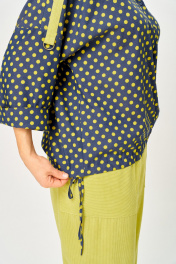 Стильный брючный комплект идеальный наряд для лета . Блузон из легкой ткани в горошек , с яркой отделкой, свободного силуэта на регулируемой кулисе по низу , воротник - втачной стойка, рукав укороченный на спущенной пройме с притачной манжетой , застежка на петли пуговицы , Брюки из облегченного вельвета , модного фасона Багги, с подрезами в запах по низу , средней посадки, без застежки, на эластичном поясе , с прорезными карманами. Длина блузона - р 50,52 - 64см, р 54,56 - 69 см. Длина брюк - 92см. Возможна замена фурнитуры.