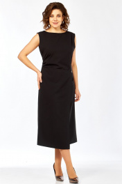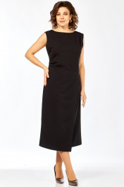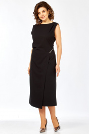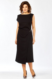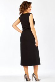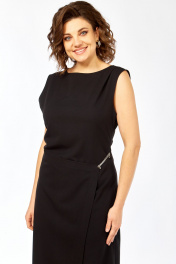 Нарядное женское платье длиной миди. Платье полуприлегающего силуэта. Вырез горловины лодочкой. В нижней части платья по переду выполнена имитация запаха, зафиксированного на декоративную цепочку. В левом боковом шве расположена потайная молния, по правому боковому шву выполнены декоративные защипы. Спинка отрезная по линии талии с талиевыми вытачками. Длина изделия по спинке 119 см. Наше черное платье подойдет как для офиса, так и для торжественных мероприятий.