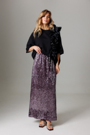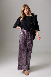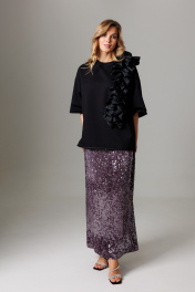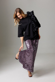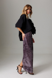 Элегантный комплект, состоящий из майки оверсайз с объемным ассиметричным воланом и длинной юбки с мерцанием и разрезом в среднем шве. Блузон свободного силуэта, со спущенной линией проймы и укороченным втачным рукавом, длиной 26 см. Акцентной деталью изделия является обьемный волан со сборкой по центру детали. Волан со сборкой расположен вертикально и со смещением относительно центра блузона. Горловина округлая, оформлена планкой 2,8 см. Длина блузона по спинке 62-65 см (в зависимости от размерного ряда). Юбка комплекта удлиненная, со средним швом, в котором располагается открытый разрез, высотой 38 см. Линия талии оформлена притачным поясом с эластичной тесьмой внутри. Высота пояса 4,5 см. Длина изделия по среднему шву 95 см. Представленная фурнитура может отличаться от представленной на фото/видео материале. Особые рекомендации: рекомендуется холодная деликатная ручная стирка, без использования отбеливающих СМС, без интенсивного трения. Сушка в вертикальном положении. ВТО с минимальным паром.