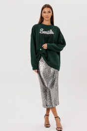 Свитшот прямого свободного силуэта oversize со спущенной линией плеча. Рукав трехшовный, оканчивается манжетой, шириной 5,5 см. По центру линии плеча, рукава, вставлены лампасы из основного трикотажного полотна шириной 4 см. Горловина имеет округлый вырез, обработана планкой по косой шириной 3 см. Низ изделия обработан планкой-манжетой, высотой 6,5 см. На фронтальной части переда расположен декоративный элемент: тесьма вытянутой прямоугольной формы и эффектная термоаппликация со стразами и нитями бисера. Длина изделия свитшота по центральной линии спинки 70-72 см (в зависимости от размерного ряда). Дополнительно к свитшоту прилагается брошь-булавка для изменения линий длины, формы или объема изделия. Юбка из эффектного трикотажного полотна с пайетками на подкладке прямого силуэта, чуть зауженная к низу. В среднем шве размещена потайная молния и открытый разрез. На линии талии размещены классические вытачки. Пояс текстильный, внутренний, обтачной. Длина юбки по среднему шву 80 см. Высота разреза 33 см. (фурнитура может отличаться от представленной на рекламном фотоматериале) Особые рекомендации: рекомендуется холодная деликатная ручная стирка, без использования отбеливающих СМС, без интенсивного трения. Сушка в вертикальном положении. ВТО с минимальным паром.