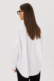 Блуза прямого свободного силуэта с рубашечным воротником на стойке и зауженным рукавом на манжете со спущенной линией плеча. Акцентная фронтальная деталь на левой полочке: графический принт. Спереди на функциональной планке петли/пуговицы. Спинка изделия имеет горизонтальную плечевую кокетку (высота кокетки 20 см) и встречную складку для свободы облегания. По плечевому шву заложена складка. Низ блузона слегка фигурный: спинка и полочка чуть длиннее бокового шва. Длина изделия блузона по спинке 73 см. Рукав рубашечный одношовный, завершается манжетой (высота 5 см) с застежкой петля/пуговица. Длина спущенного плечевого шва 33 см. Длина рукава с манжетой 41 см. (фурнитура может отличаться от представленной на рекламном фотоматериале) Особые рекомендации: рекомендуется холодная деликатная ручная стирка, без использования отбеливающих СМС, без интенсивного трения. Сушка в вертикальном положении. ВТО с минимальным паром.