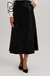 Юбка выполнена из эко-кожи, состоит из восьми клиньев с умеренным расширением по низу изделия. В боковых швах расположены наклонные функциональные карманы. В центральном шве полочки расположена застежка на молнию. Линия талии обработана притачным поясом со шлевочными держателями. В боковых сегментах пояса вставлена эластичная тесьма для дополнительного регулирования объема талии. Высота пояса 4,5 см. Застежка в поясе на две функциональные петли/пуговицы.