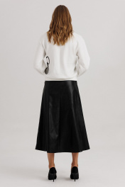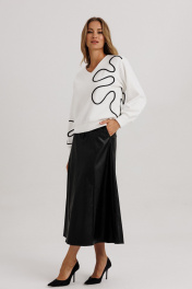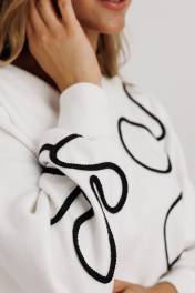 Эффектный элегантный блузон с контрастным кантом. Блузон из уютного трикотажного полотна, свободного прямого силуэта. Линия плеча чуть спущена, рукав прямой на зауженной манжете. Длина рукава вместе с плечевой линией 78 см. Из них 13 см: длина плеча и 65 см: длина рукава с напуском. Высота манжета 8 см. Декоративным элементом блузона выступает контрастный рисунок, напоминающий элементы лепестков цветочного узора. Расположены эти элементы ассиметрично, на одном из рукавов, также полочке и частично в боковом сегменте спинки блузона. Рисунок создан трикотажным кантом. Горловина оформлена угловым вырезом на полочке и оформлена притачным обтачным элементом. Низ блузона оканчивается притачной манжетой, высотой 7,5 см. Длина блузона по спинке изделия 61 см. (фурнитура может отличаться от представленной на рекламном фотоматериале)