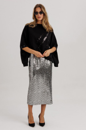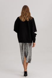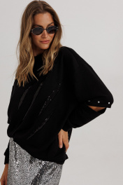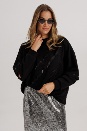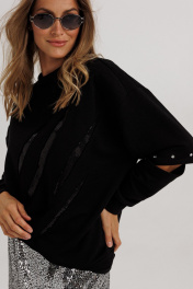 Блузон из уютного трикотажного полотна, свободного прямого силуэта. Линия плеча спущена, рукав прямой, на зауженной манжете. Линия плеча состоит из притачного элемента: погона. Рукав основной состоит из двух деталей, в горизонтальном шве стачивания данных деталей расположен открытый разрез. По верхнему срезу расположены стразы. При желании длина рукава может трансформироваться и отверстием выступает открытый разрез. Длина рукава, вместе с плечевой линией 75 см. Из них 13 см: длина плеча и 62 см: длина рукава. Высота манжета 5 см. На центральной части переда блузона расположены декоративные аппликационные элементы, в виде ассиметричных полос из пайеток. Горловина округлая, оформлена притачной планкой, высотой 3 см. Низ блузона оканчивается притачной манжетой, высотой 6 см. Длина блузона по спинке изделия 70 см.