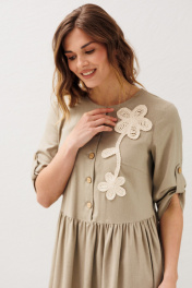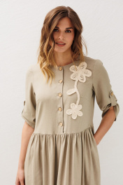 Восхитительное платье свободного силуэта с отрезной линией талии и рукавом укороченной длины. Полочка и спинка платья отрезные по линии талии. Спереди расположены наклонные горизонтальные нагрудные вытачки и фронтально-вертикальная бортовая застежка на петли/пуговицы. Декоративным элементом выступает настрочная ассиметричная вязанная нашивка в виде цветка. Горловина округлой формы. Спинка имеет отрезную горизонтальную кокетку. Рукав втачной, с предполагаемым отворотом, который поддерживает пата. Пата может быть закреплена на пуговицу (29 см). Длина рукава без паты 43 см. Юбка платья А-силуэта. По линии талии умеренная сборка. В боковых швах расположены внутренние карманы и разрезы, высотой 30 см. Длина платья по спинке 123-129 см (в зависимости от размерного ряда). (фурнитура может отличаться от представленной на рекламном фотоматериале) 44 р: ОГ 92 см, ОТ 92 см, ОБ сборка, длина 123 см, о.рук 35 см; 46 р: ОГ 96 см, ОТ 96 см, ОБ сборка, длина 123 см, о.рук 36 см; 48 р: ОГ 100 см, ОТ 100 см, ОБ сборка, длина 123 см, о.рук 37 см; 50 р: ОГ 104 см, ОТ 104 см, ОБ сборка, длина 129 см, о.рук 38 см; 52 р: ОГ 108 см, ОТ 108 см, ОБ сборка, длина 129 см, о.рук 40 см; 54 р: ОГ 112 см, ОТ 112 см, ОБ сборка, длина 129 см, о.рук 42 см.