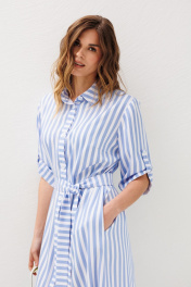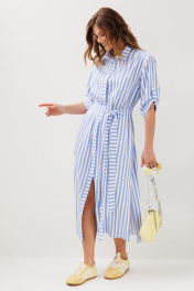 Стильное платье в стиле сафари свободного прямого силуэта с укороченным рукавом и съемным поясом. Платье прямого свободного силуэта с втачным рукавом. На полочках горизонтальные нагрудные вытачки. В боковых швах внутренние карманы и открытые разрезы высотой 39-41 см. Спинка платья имеет горизонтальную кокетку, высотой 14,5 см. По центру переда функциональная застежка петли/пуговицы. Горловина обработана воротником рубашечного типа на стойке. Рукав втачной, одношовный, с цельнокроеной манжетой и патой, которая трансформирует длину рукава и форму рукава, делая его короче/длиннее с помощью петли-пуговицы. Длина рукава 43 см. Длина изделия по спинке 123 см. Для подчеркивания линии талии прилагается съемный текстильный пояс, шириной 4,5 см (фурнитура может отличаться от представленной на рекламном фотоматериале)