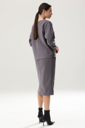 Роскошный комплект: блузон и юбка из тканой замши глубокого тона. Блузон прямого свободного кроя. Перед блузона разделен ассиметричной вертикальной линией с декоративным швом строчкой 0.7 см и горизонтальными складками-защипами, шириной 0.7 см. Блузон имеет округлую горловину и спущенную линию плеча. Рукав одношовный, со спущенным окатом, зауженный к запястью. Длина рукава 3/4.(37см) На одном рукаве, в качестве декора, притачена небольшая нашивка-отделка. На спинке изделия расположена в качестве застежки-потайная молния. Длина блузона по линии спинки 56-57 см(в зависимости от размерного ряда). Юбка комплекта на подкладке, прямого силуэта, чуть заужена к низу. Спереди юбки, со смещенным центром влево - вертикальные линии отделочные складки, шириной 0.7 см с отделочной строчкой. В крайней из этих складок расположена шлица с открытым разрезом, высотой 33 см. В среднем шве заднего полотнища расположена застежка - потайная молния. По линии талии расположены вытачки. Изделие на поясе, высотой 3,5 см. В боковых отрезках пояса эластичная тесьма. Фиксируется пояс сзади на функциональную застежку петля-пуговица. Длина юбки-70 см *фурнитура может отличаться от представленной на рекламном фотоматериале Особые рекомендации: рекомендуется холодная деликатная ручная стирка, без использования отбеливающих СМС, без интенсивного трения. Сушка в вертикальном положении. ВТО с минимальным паром.