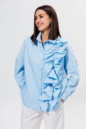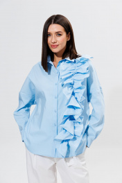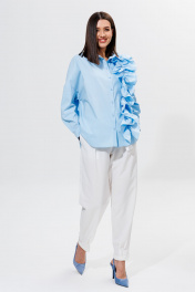 Шикарный комплект классических светлых тонов: голубого и белого, состоящий из свободной блузы рубашечного кроя с вертикальной рюшей и современных брюк. Блуза прямого свободного силуэта с рубашечным воротником на стойке и зауженным рукавом на манжете, со спущенной линией плеча. Акцентная фронтальная деталь: вертикально ассиметричная рюша. Сборка по центру рюши придает форму отделочной детали, спереди на функциональной планке петли-пуговицы. Спинка изделия имеет горизонтальную плечевую кокетку и встречную складку для свободы облегания. По плечевому шву заложена складка. Низ блузона слегка фигурный: спинка и полочка чуть длиннее бокового шва. Длина изделия блузона по спинке 73,5 см. Рукав рубашечный одношовный, завершается манжетой (высота 5 см) с застежкой петля-пуговица. Длина спущенного плечевого шва 33 см. Длина рукава с манжетой 41 см. Брюки современного силуэта. Карманы-хулиганы расположены в боковых швах. На задней части брюк расположен ложный карман-листочка. Фронтальная застежка на клапан-молнию (гульфик) и пуговицу. Для дополнительной фиксации объема талии спереди расположены полупояса с пряжкой из полуколец. На линии талии переда, также расположены складки-защипы для свободы входа в карман. На передних полотнищах брюк внизу заложены две модельные складки для уменьшения ширины низа изделия. Оканчиваются брюки деликатным отворотом, шириной 2,5 см. Длина брюк по боковому шву с отворотом 93 см (без учета пояса). Представленная фурнитура может отличаться от представленной на фото/видео материале. Особые рекомендации: рекомендуется холодная деликатная ручная стирка, без использования отбеливающих СМС, без интенсивного трения. Сушка в вертикальном положении. ВТО с минимальным паром.