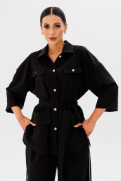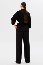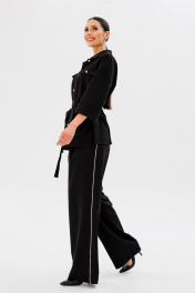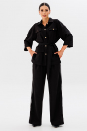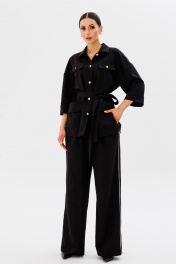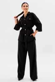 Стильный современный комплект, состоящий из блузона и брюк в стиле палаццо. Блузон прямого свободного силуэта, со спущенной линией плеча и одношовным рукавом с отворотом. Спинка имеет центральный средний шов и притачные детали баски на уровне линии талии, которые заходят друг на друга, образуя шлицы. Горизонтально расположена на линии талии настрочная деталь (шлевочная), длиной 23 см и высотой 5,5 см для съемного текстильного пояса, который может фиксировать линию талии на мягкий узел. Спереди полочки расположены горизонтально накладные верхние клапаны, которые фиксируются пуговицами и нижние накладные прямоугольные функциональные карманы с отлетными фигурными отворотами. Воротник рубашечного кроя с полустойкой. Центральная часть изделия обработана подбортами и застежкой на петли/пуговицы. В боковых швах изделия расположены открытые разрезы высотой 16-18 см. Линия плеча спущена, рукав одношовный, с отворотом, длиной 3/4, при желании отворот опускается и длина рукава становится 7/8. Длина изделия по спинке 69-73 см (в зависимости от размерного ряда). Брюки комплекта созданы в свободном стиле палаццо. В пояс брюк по спинке вставлена эластичная тесьма, шириной 3 см. Спереди пояс фиксируется горизонтально на петли/пуговицы и вертикалную закрытую клапан-молнию (гульфик). При желании в пояс можно вставить ремень, так как имеются шлевочные детали. В боковых швах: карманы с наклонным входом, на поясной линии талии расположены две неглубокие складки для свободы движения. Декоративным акцентом брюк является контрастный кант, вставленный в боковые швы. Длина изделия по боковому шву 107 см. (фурнитура может отличаться от представленной на рекламном фотоматериале) Особые рекомендации: рекомендуется холодная деликатная ручная стирка, без использования отбеливающих СМС, без интенсивного трения. Сушка в вертикальном положении. ВТО с минимальным паром.