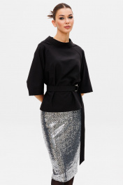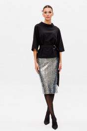 Блузон прилегающего силуэта с разрезами по боковым швам (по 7 см). На передней части изделия горизонтальные вытачки. В среднем шве спинки потайная застежка - молния. Горловина обработана стойкой-воронкой, высотой 4.5 см. Длина блузона по спинке от стойки-54 см. Рукав-реглан, чуть расклешен к низу. Длина рукава от горловины-стойки 46 см. Юбка на подкладке прямого силуэта, чуть зауженная к низу. В среднем шве размещена потайная молния и открытый разрез. На линии талии размещены классические вытачки. Пояс внутренний, обтачной. Длина юбки по боковому шву-70 см. Высота разреза-21 см. Комплект дополнен съемным текстильным поясом на пряжке. Представленная фурнитура может отличаться от представленной на фото/видео материале. Особые рекомендации: рекомендуется холодная деликатная ручная стирка, без использования отбеливающих СМС, без интенсивного трения. Сушка в вертикальном положении. ВТО с минимальным паром.
