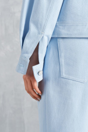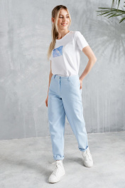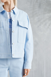 Джуд из джинса свободного силуэта со спущенным плечевым поясом, отложным воротником и крупными нагрудными карманами. Застёжка на металлические джинсовые пуговицы. Брюки из джинса с вытачками от кармана и по низу, кокеткой и накладными карманами сзади. Длина брюк по боковому шву от пояса - 92 см. Длина по шаговому шву - 70 см.