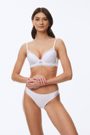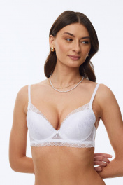 Бюстгальтер с формованной чашкой (минимальный эффект «пуш-ап») и удлинённым кружевным станом, декорированный эластичным кружевом по всей чашке. В модели присутствуют каркасы («косточки»). Широкие кружевные бочки укреплённые пластиной. Бретели регулируются по длине.