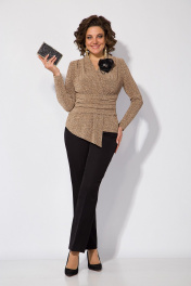 Эффектная нарядная блузка, выполнена из мягкого трикотажа с мерцающим эффектом. Такой дизайн ткани придает необычное переплетение нитей: с изнанки мягкий однотонный трикотаж! Вырез горловины мягкая стойка, переходящая в V-образный вырез с имитацией запаха. По полочке заложены декоративные складки для комфортного прилегания изделия. Низ блузки ассиметричный. Пояс декорирован задрапированным поясом из основной ткани, что зрительно стройнит и скрывает все недостатки фигуры. Рукав в точной, длинный. Спинка приталенная, без особенностей. К блузке предусмотрен съемная брошь, в виде цветка. Отлично сочетается с базовыми однотонными брюками из коллекции Лилиана. Длина по спинке – 63 см, рукав – 62 см. По переду – 74 см.