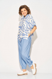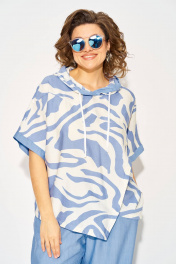 Стильный летний костюм, состоящий из удлиненной туники свободного покроя и брюк. Оригинальная туника из вискозы добавлением льна. Модель с цельнокроеным укороченным рукавом и ассиметричным подрезом по полочке. Модель с легким капюшоном и кулисой на шнуровке. Низ изделия разноуровневый. Спинка цельная. В комплекте свободные брючки, завышенной посадки. Брюки на притачном поясе с круговой резинкой. Имеются боковые карманы. Низ с заложенными складками, что придает изделию более спортивный образ. Длина туники по спинке - 68 см, рукав – около 30 см. Брюки – 98-100 см.