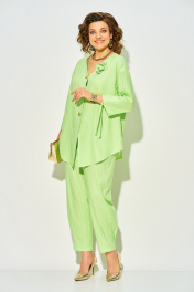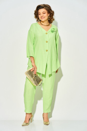 Эффектный летний костюм, из натурального льна с добавлением вискозы; состоит из свободной блузки и брюк. Блузка свободного силуэта, со спущенной линией плеча и рукавом длиной ¾-ти. Модель c V-образной линией горловины с центральной застежкой на петли и пуговицы. По центру рукава расположена кулиска с утяжкой на шнуровку. Спинка с центральным швом, переходящий в шлицу с декоративными клапанами на пуговицах. Брюки в костюме с завышенной посадкой, на притачном поясе с круговой резинкой. По бокам имеются рабочие карманы. Низ брюк с заложенными складками. Отличный вариант на жаркую солнечную погоду; для особого случая и легкого променада! Длина по спинке – 80 см. Рукав – 40 см. Брюки – 96-98 см.