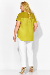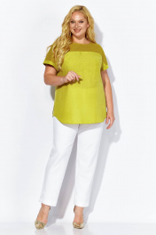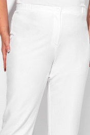 Женский брючный комплект на рост 164 см состоящий из брюк и блузки. Брюки зауженные к низу. На поясе, эластичная лента по бокам, застежка на молнию и пуговицу. Блузка прямого силуэта. Вырез горловины круглый. Рукав короткий цельнокроеный с отложной манжетой. Перед и спинка блузки с кокетками из хлопкового ришелье. Нагрудные вытачки из проймы