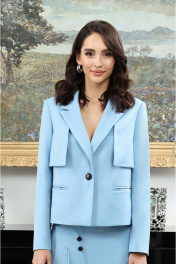 Костюм юбочный Жакет с центральной застёжкой на петлю с пуговицей и стояче-отложным воротником пиджачного типа. Изделие с отлетной кокеткой по переду и спинке. Перед с карманами в рамку в нижней части. Рукава втачные. Изделие на подкладке. Юбка на притачном поясе и фигурным низом по переду. Переднее полотнище частично со складками и декоративными пуговицами. Изделие с наклонным карманом к боковому шву с одной стороны. Заднее полотнище с потайной молнией в среднем шве. Юбка на подкладке. ВОЗМОЖНА ЗАМЕНА ФУРНИТУРЫ НА АНАЛОГИЧНУЮ ТАКОГО ЖЕ КАЧЕСТВА.