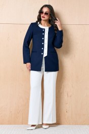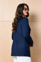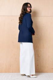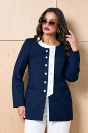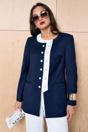 Жакет с округлым вырезом горловины, смещённой застёжкой на петли и пуговицы, и одним рядом декоративных пуговиц. Перед с карманами в нижней части и декоративной деталью из контрастной ткани по борту и горловине. Спинка со средним швом и талиевыми вытачками. Жакет на подкладке.