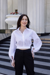 Женская хлопковая рубашка укороченного фасона с эластичной утягивающей резинкой на нижней кромке прекрасно подойдёт для создания модного делового образа на работу, учёбу или для повседневных аутфитов.