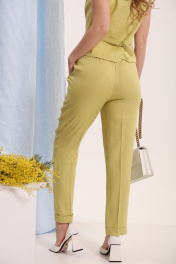 Элегантный комплект, состоящий из жилета и брюк. Женский жилет прилегающего силуэта. На полочках нагрудные вытачки переведены в рельефы и линию кармана. Карманы прорезные в рамку. На спинке плечевые вытачки и рельефы. В рельефах, на уровне талии два хлястика с застежкой на полукольца. По низу детали спинки фигурный вырез. Жилет на подкладке. Застежка центральная на четыре петли и пуговицы. Длина жилета до уровня бедер. У жилета высокая линия проймы, что позволяет носить его как отдельный элемент, без нижнего слоя одежды. Удобные зауженные брюки из лёгкой ткани, со льном в составе. Брюки свободного прилегания по бедрам, в пояс вставлена эластичная тесьма с кулисой и втянутым шнурком. Вход в карман фигурный, наклонный к боковому шву. По низу брюк оформлены подвороты. Рост фотомодели 169 см. Размер у фотомодели – 44.