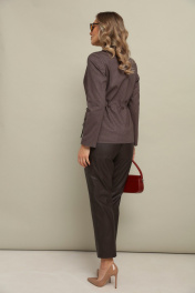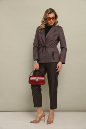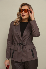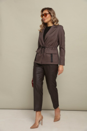 Комлект 2ка состоит из жакета и брюк. Однобортный жакет на подкладке прямого силуэта с застёжкой на две петли и пуговицы. По талии расположена кулиса и шнурок для приталивания жакета. По переду расположены накладные карманы с клапаном и декором. Зауженные брюки из экокожи. Пояс на эластичной тесьме и втянутым шнурком. Вход в карман фигурный, наклонный к боковому шву. Длина жакета по спинке 68-72 см.