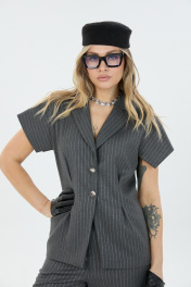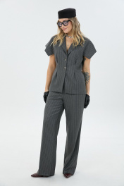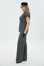 Комплект 2ка, состоящий из жилета и брюк. Приталенный жилет с застроченными защипами, короткими цельнокроеными рукавами-плечами и застёжкой на петлю и пуговицу. Брюки широкого объема, прямого силуэта. В боковых швах расположены карманы. Застежка-гульфик. Пояс отрезной, притачной. В задней части пояса вставлена эластичная тесьма (резинка). Пояс застегивается на петлю и крючок.