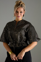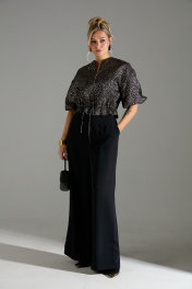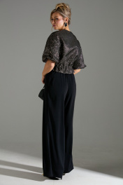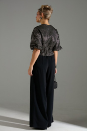 Комплект 2-ка, состоящий из жакета и брюк. Жакет с застёжкой на молнию и объёмными рукавами. Линия талии на кулисе и завязке из основной ткани. Брюки широкого объема, прямого силуэта. В боковых швах расположены карманы. Застежка-гульфик. Пояс отрезной, притачной. В задней части пояса вставлена эластичная тесьма (резинка). Пояс застегивается на петлю и крючок.