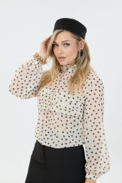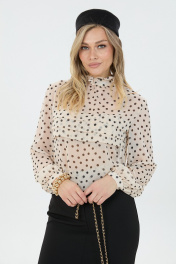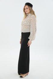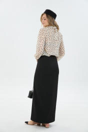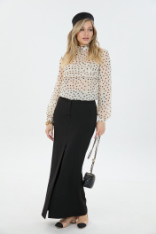 Элегантная блуза из легкой ткани свободного силуэта с принтом "горох". По переду блузки добавлен оригинальный элемент в виде складок. Юбка длины "макси" с высоким разрезом по переду.