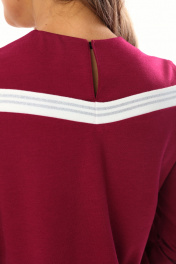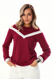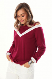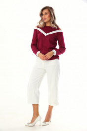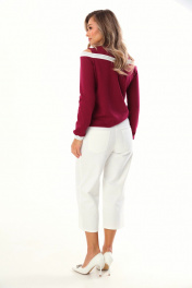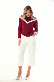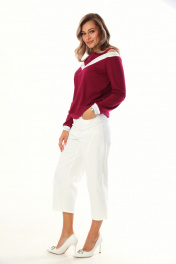 Комплект 2ка, состоящий из джемпера и брюк. Джемпер свободного объёма, оригинального кроя, с имитацией топа и открытыми плечами. Горловина круглая, по спинке застежка на петлю и пуговицу. Отделка горловины джемпера и манжеты выполнены из довязов в контрастном цвете. Брюки капри, зауженные к низу, выполнены из джинсовой ткани. По переду и сзади расположены карманы. Застежка на пуговицу и молнию.