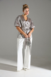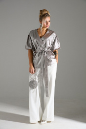 Комплект 2ка, состоящий из жакета и брюк. Легкий жакет на подкладке с объёмными рукавами. Перед на запах , застежка на кнопки, под пояс по талии. Длина жакета 72-78 см. Брюки широкого объема, прямого силуэта. На передних половинках брюк заутюжены стрелки, переходящие в складки по линии талии. На задних половинках также заутюжены стрелки. В боковых швах расположены карманы. Застежка-гульфик. Пояс отрезной, притачной. В задней части пояса вставлена эластичная тесьма (резинка). На пояс настрочены шлевки. Выступающая часть пояса застегивается на петлю и крючок.