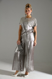 Комплект 2-ка из лёгкой ткани, состоящий из блузки и брюк. Блузка свободного объёма с короткими цельнокроеными рукавами с подворотами. Вырез горловины круглый. По переду подрез ниже линии груди. Верх блузки по переду выполнен из ткани расшитой пайетками. Широкие брюки-кюлоты свободного оригинального кроя с застёжкой на пуговицы. Без карманов.
