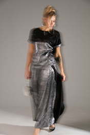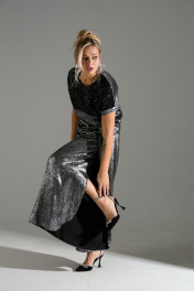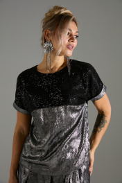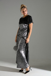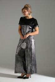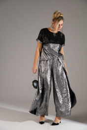 Комплект 2-ка из лёгкой ткани, состоящий из блузки и брюк. Блузка свободного объёма с короткими цельнокроеными рукавами с подворотами. Вырез горловины круглый. По переду подрез ниже линии груди. Верх блузки по переду выполнен из ткани расшитой пайетками. Широкие брюки-кюлоты свободного оригинального кроя с застёжкой на пуговицы. Без карманов.