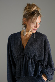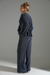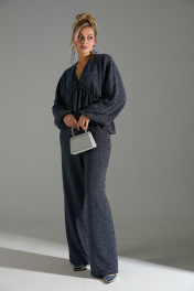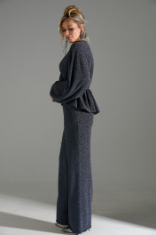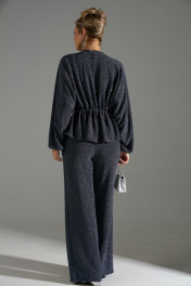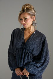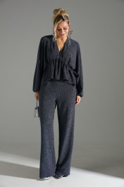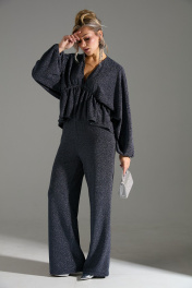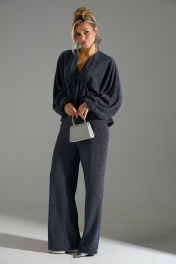 Костюм 2ка, состоящий из блузки и брюк. Блузка свободного силуэта с V-образным вырезом горловины. Рукав блузки цельнокроеный, по низу собранный на резинку. По линии груди вставлена эластичная резинка. Брюки прямого силуэта с резинкой по талии.
