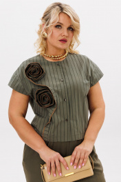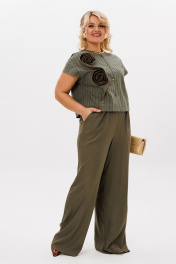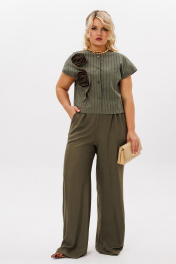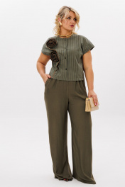 Комплект 2ка, состоящий из блузки и брюк. Укороченная блузка с короткими рукавами и застёжкой на пуговицы. Вырез горловины круглый. По переду выполнен декор из основной ткани в виде цветов. Брюки прямого силуэта на эластичной резинке по талии. По переду расположены карманы с наклонным входом.