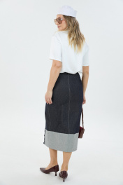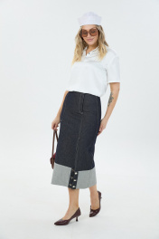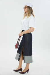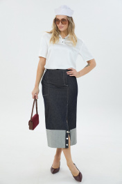 Джинсовая юбка длины миди с высоким разрезом по переду и боковым карманом с одной стороны. Застёжка юбки ассиметричная в виде молнии и пуговицы. По низу юбки выполнен подворот с имитиацией застёжки на пуговицы.